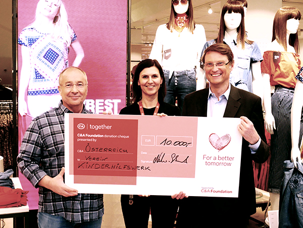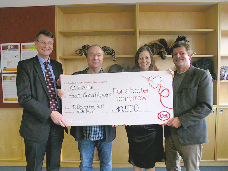 Soziale Verantwortung wird bei C&A großgeschrieben. Bereits zum wiederholtem Male unterstützte das Unternehmen C&A das Kinderhilfswerk mit einer großzügigen Spende von 10.500 Euro. Die Spendenübergabe fand am 14. Dezember statt, 10 Tage vor Heiligabend.