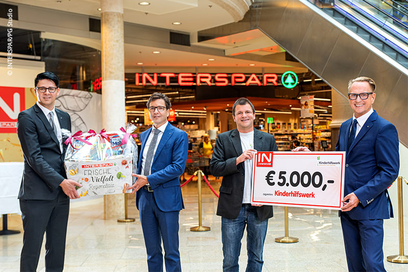 Anlässlich der Eröffnung des neuen INTERSPARS in der PlusCity in Pasching überreichten Mag. Markus Kaser, Geschäftsführer INTERSPAR Österreich, Geschäftsleiter Almin Paunovic und Regionaldirektor Stefan Pockenauer eine Spende in Höhe von 5.000 Euro an das Kinderhilfswerk.