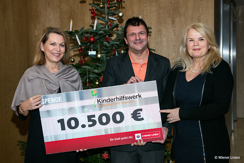 Im Rahmen einer kleinen Adventfeier überreichte Wiener-Linien-Geschäftsführerin Alexandra Reinagl jetzt einen Spendenscheck über 10.500 Euro an Dr. Brigitte Schimpl und Peter Begsteiger vom Kinderhilfswerk.